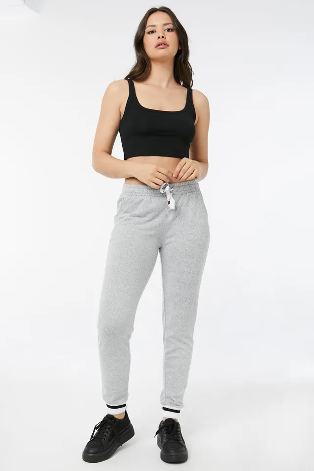 Knitted slip on pants. Elastic waist with beaded drawstring Tapered ankles with stripe detail 92% polyester, 8% spandex Model is wearing size S | Ardene Accent Hem Knit Sweatpants in Grey | Size XS | Polyester/Spandex