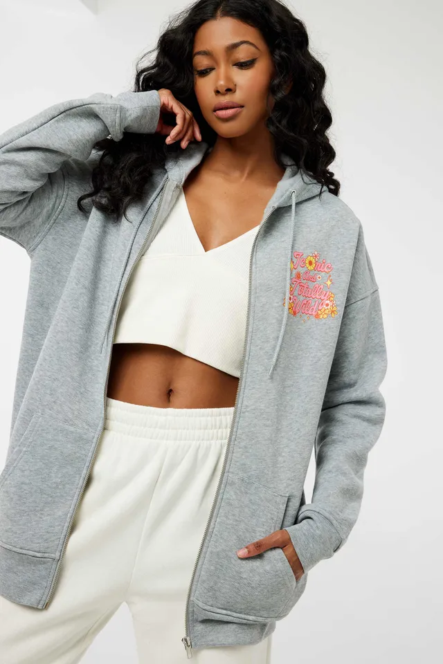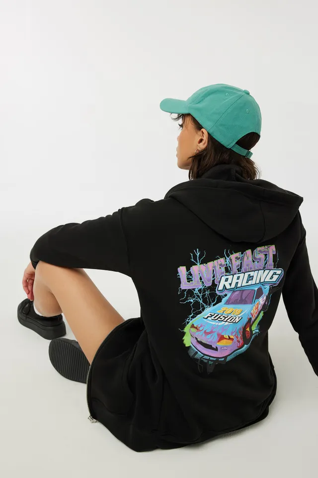 Oversized zip-up hoodie. Long sleeves Full-length zipper closure Kangaroo pouch Choice of graphic prints 100% polyester Model is wearing size S | Ardene Back-Print Zip-Up Hoodie in Black | Size XS | Polyester