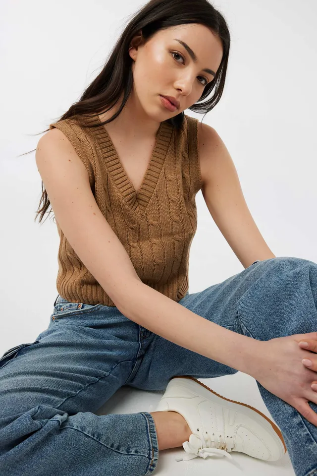 Cable knit sweater vest. V-neck Ribbed edging Classic fit 100% acrylic Model is wearing size S | Ardene Cable Sweater Vest in Beige | Size Small | 100% Acrylic