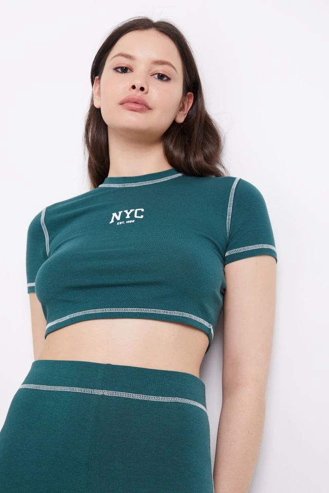 Cropped t-shirt in jersey knit. Crew neck Short sleeves Placement print at front Contrast overlock seams 55% polyester, 39% cotton, 6% elastane Model is wearing Size S Wear it with the matching bottom: 2A-AP31695-02 | Ardene Contrast-Seam Cropped Tee in White | Size XS | Polyester/Cotton/Elastane