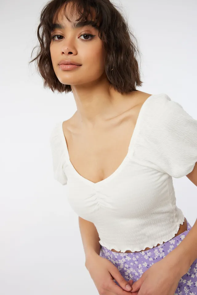 Knitted cropped top. V-neck Short balloon sleeves Ruched front Lettuce border 60% polyester, 30% rayon, 10% spandex Model is wearing size S | Ardene Cropped Ruched Top with Balloon Sleeves in White | Size XS | Polyester/Rayon/Spandex
