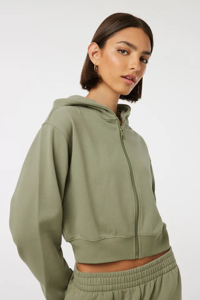 Ardene Cropped Zip-Up Hoodie In Khaki | Size | Polyester/Cotton | Fleece-Lined