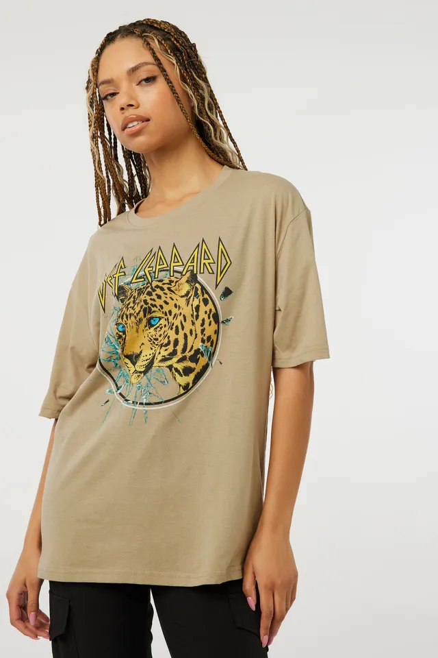 Cotton knit t-shirt. Crew neck Short sleeves Oversized fit Graphic print 100% cotton Model is wearing size SOfficial licensed product of Def Leppard. | Ardene Def Leppard Graphic Tee in Beige | Size XS | 100% Cotton