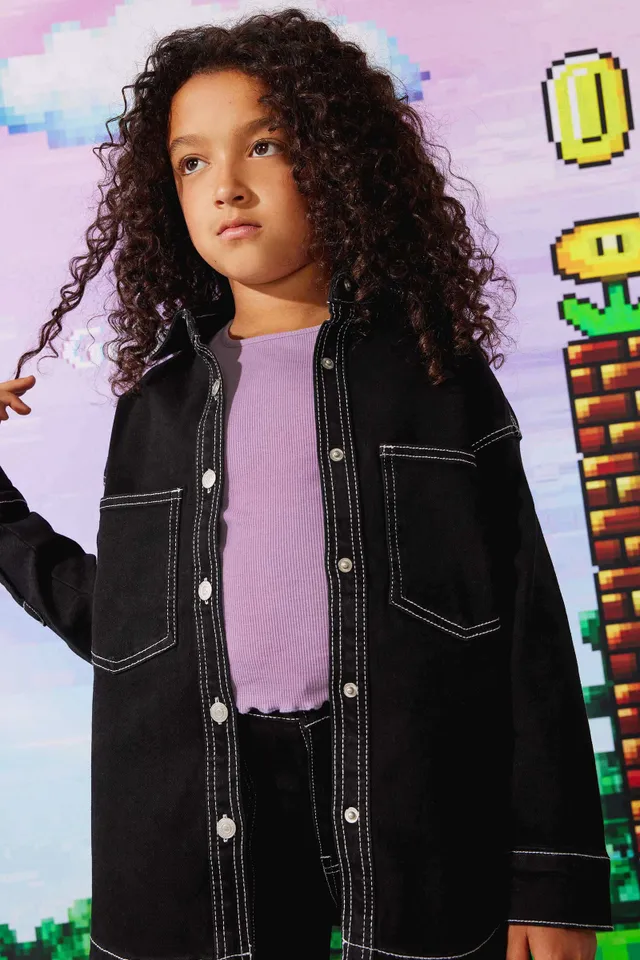 Exclusive piece from our Ardene Kids collection. Jean overshirt for kids. Brest pockets Buttons down the front 68% cotton, 30% polyester, 2% spandex Models in Blue shacket are wearing size XS and LModels in Black shacket are wearing sizes S and L | Ardene Denim Shacket in Black | Size XS | Polyester/Spandex/Cotton