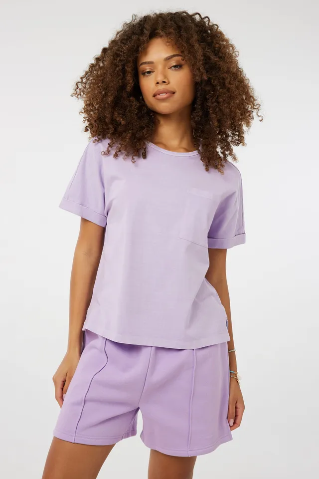 Cotton jersey dolman t-shirt. Crew neck Rolled short sleeves Exposed seams Patch pocket 100% cotton Model is wearing size S | Ardene Dolman Tee with Pocket in Lilac | Size Small | 100% Cotton