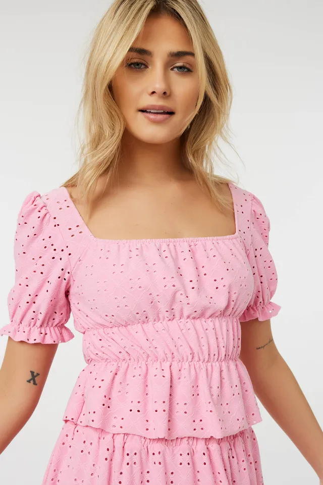 Eyelet lace top. Square neckline Short balloon sleeves Ruched waist Cropped length Available in White and Pink 95% polyester, 5% spandex Model is wearing size SComplete the look: 3A-AP32068-12 or 3A-AP32070-12 | Ardene Eyelet Lace Balloon Sleeve Top in Lt. Pink | Size XS | Polyester/Spandex