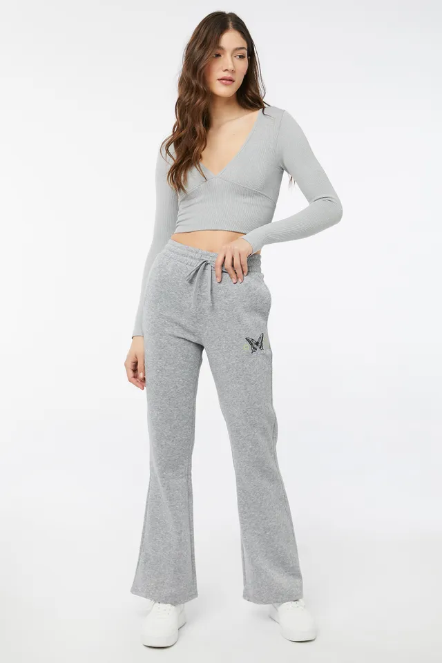 Flare knitted sweatpants. Elastic waist with drawstring Side pockets Choice of prints 100% polyester Model is wearing size S | Ardene Graphic Flare Sweatpants in Grey | Size XS | Polyester