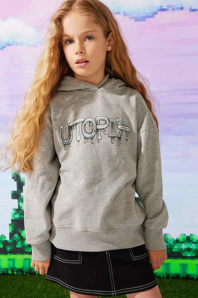 Exclusive piece from our Ardene Kids collection. Oversized hooded sweatshirt for kids. Long sleeves Ribbed edging Choice of prints 65% polyester, 35% cotton peach fleece Models are wearing sizes XS and L | Ardene Graphic Oversized Hoodie in Grey | Size XS | Polyester/Cotton
