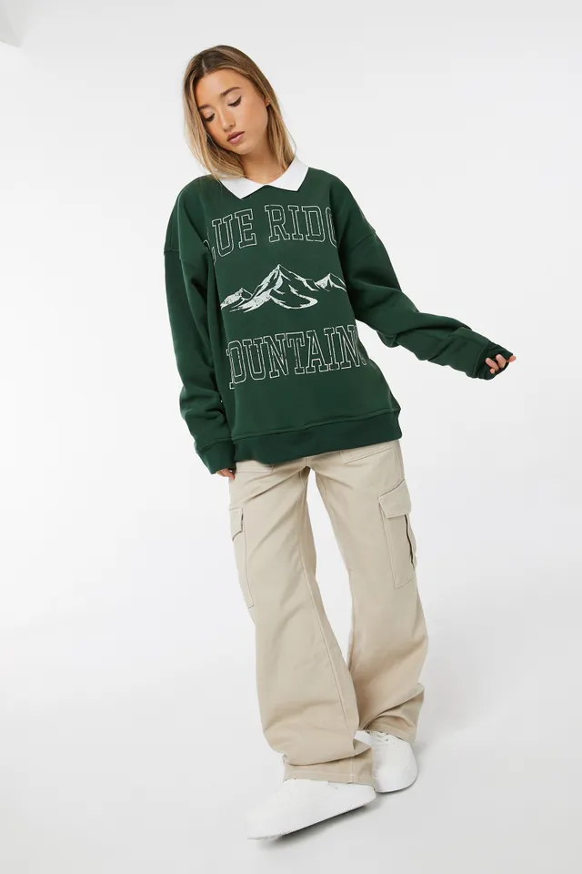 Sweatshirt with shirt collar. Fleece-lined Dropped shoulder Oversized fit Graphic print 100% polyester Model is wearing size S | Ardene Graphic Polo Sweatshirt in Green | Size XS | Polyester | Fleece-Lined