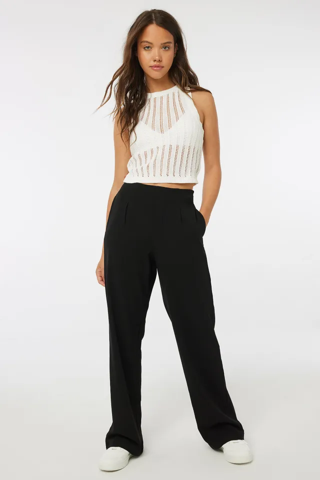 Crepe knit tailored pants. Button and fly Pleats in front Wide leg 96% polyester, 4% spandex Model is wearing size S | Ardene High Rise Wide Leg Pleated Pants in Black | Size XS | Polyester/Spandex