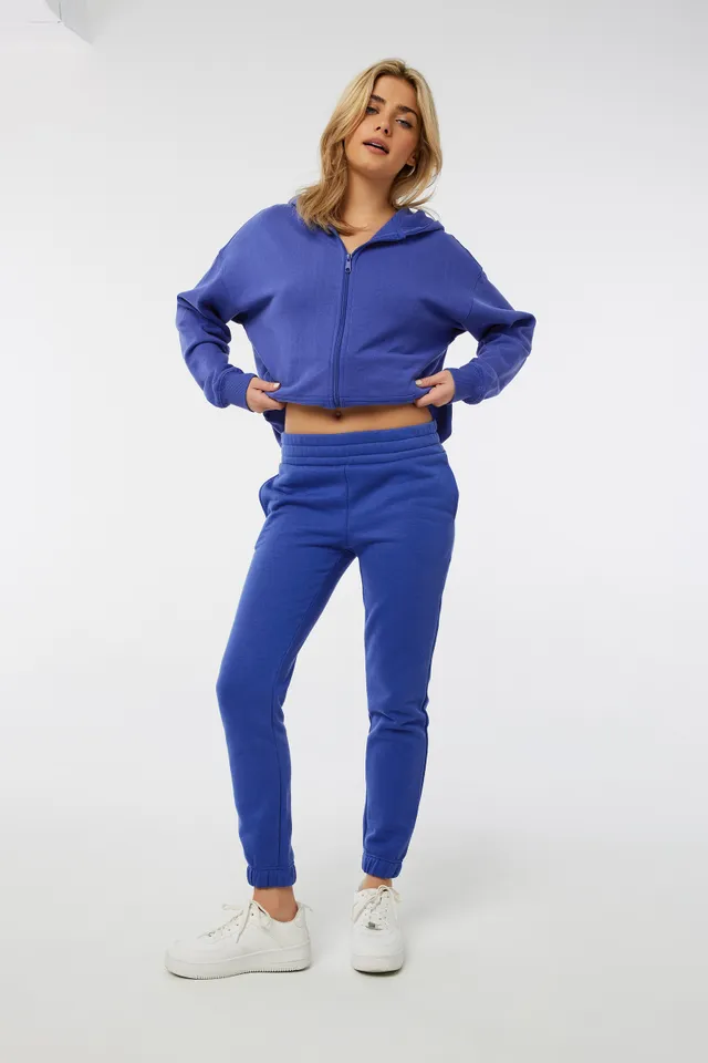 Fleece-lined sweatpants. Elastic waistband and cuffs Side pockets Slim fit 65% polyester, 35% cotton Model is wearing size S | Ardene Slim Fit Sweatpants in Blue | Size XS | Polyester/Cotton | Fleece-Lined