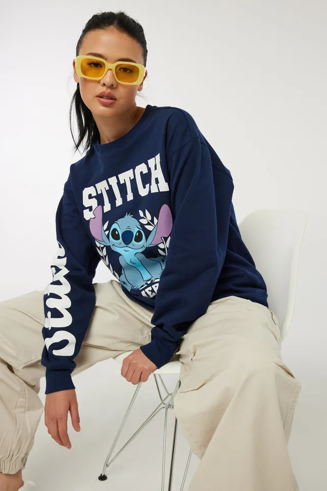 Long-sleeve sweatshirt. Fleece-lined Stitch print Summer Vibes lettering 55% cotton, 45% polyester fleece Model is wearing size SOfficial licensed product of Disney. | Ardene Stitch Summer Vibes Sweatshirt in Dk. Blue | Size Small | Polyester/Cotton | Fleece-Lined