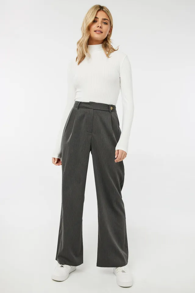 Woven knit pants. Button and fly closure Belt loops Side pockets Wide leg 80% polyester, 16% rayon, 4% spandex Model is wearing size S | Ardene Wide Leg Tailored Pants in Grey | Size Small | Polyester/Rayon/Spandex