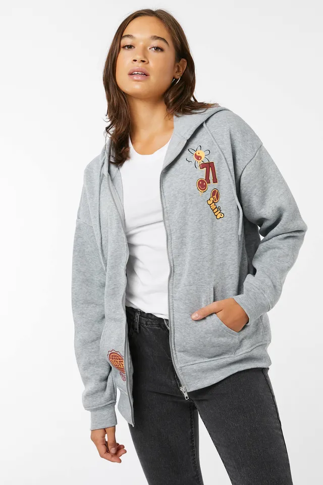 Oversized zip-up hoodie. Fleece-lined Embroidery detail Kangaroo pockets 100% polyester Model is wearings size S | Ardene Zip-Up Hoodie with Embroideries in Grey | Size XS | Polyester | Fleece-Lined