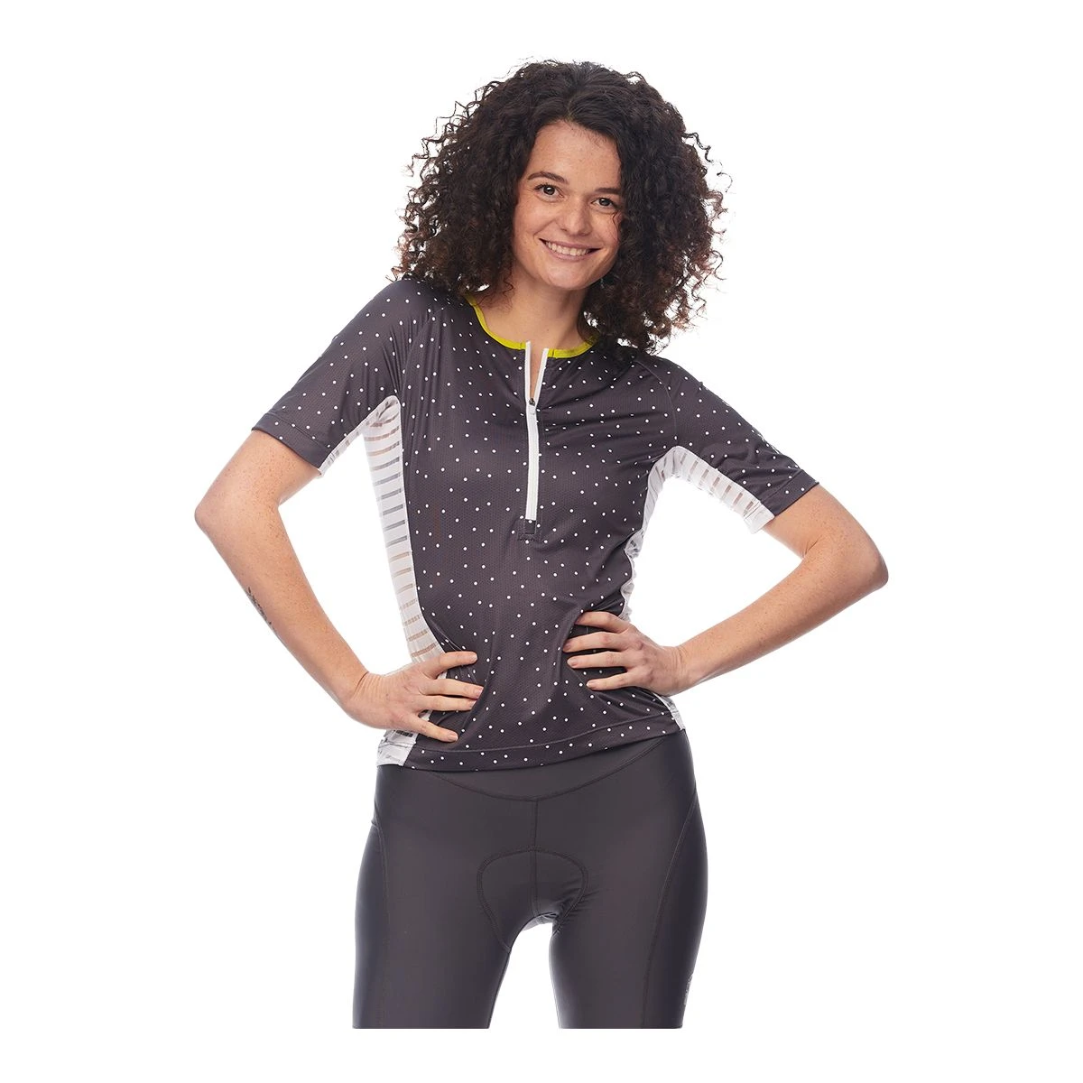 The JolieRide Spin jersey lives up to its name as it will surely turn heads on your way. You will appreciate the lightness of the fabric and its anti-UV 50+ sun protection will ensure you have the most comfortable rides during the beautiful summer days.Our gift to you: This short-sleeved top is automatically equipped with matching arm warmers to keep you warm on chilly days or to protect you from the sun.