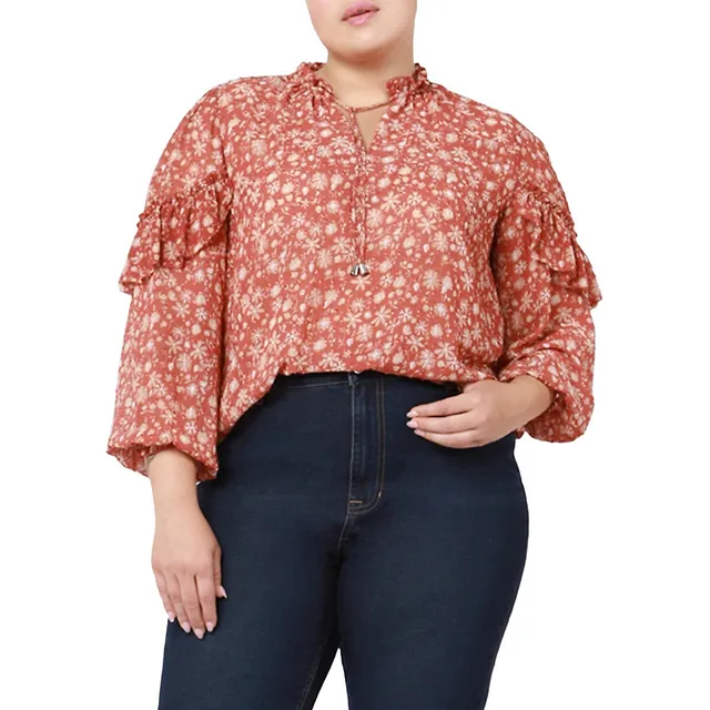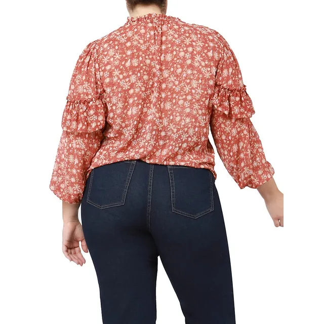 Plus Floral Ruffle-Shoulder Tie-Up-Neck Top
